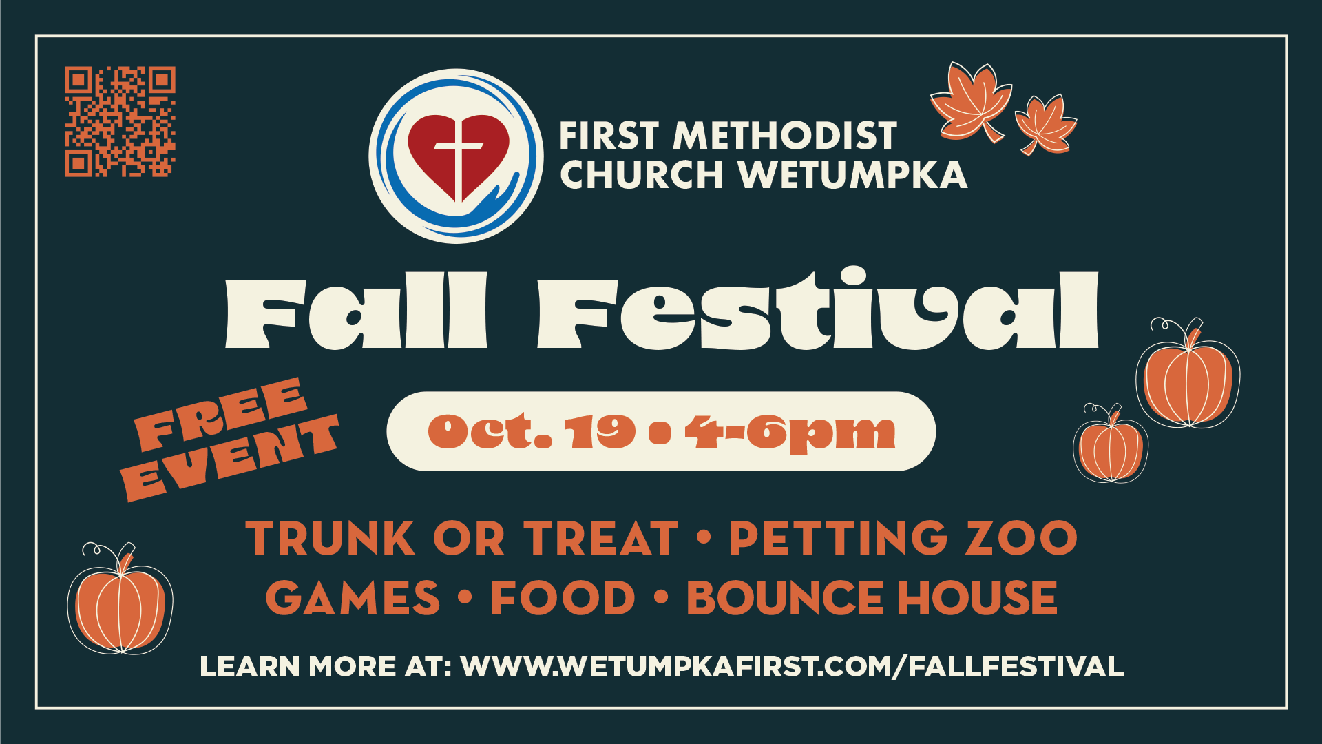 You are invited to the Fall Festival at First Methodist Church Wetumpka! There will be lots candy, trunk or treat, petting zoo, bounce house, face painting, games, food, and family fun!